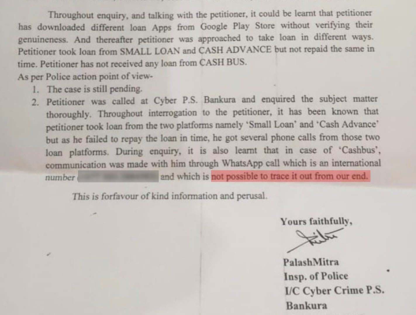 The police mail on the action taken status states: “It has been known that the petitioner took a loan from the two platforms, namely “Small Loan” and “Cash Advance”, but as he failed to repay the loan in time, he got several phone calls from those two loan platforms. During the enquiry, it was also learnt that in the case of “Cashbus”, communication was made with him through WhatsApp call, which is an international number and which is not possible to trace out from our end.”