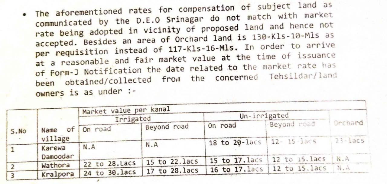 Deputy Commissioner Budgam, through his communication dated 11.7.2015, provided a list of villages with the market rate of the land in each of the locations. The Deputy Commissioner (DC) Budgam emphasised that the average rates in these villages were between 18 to 25 lakhs per kanal. In addition, a list of seven villages was also provided where the government had acquired land for various public purposes between 2008 and 2011. These villages/habitations, including Ompora, Rangreth, Wathoora, Humhama, Gudsathoo, Gogo, are located just 1 to 2 kms from the area where land is to be acquired by Defence Estates Department (DED). The compensation provided in these areas ranged between 10 to 15 lakhs per kanal, said the Deputy Commissioner, Budgam in his official communication, and he reiterated that Rs 18 to 20 lakhs per kanal rate was the final rate that was unanimously recommended by the district administration in consultation with the revenue officials.