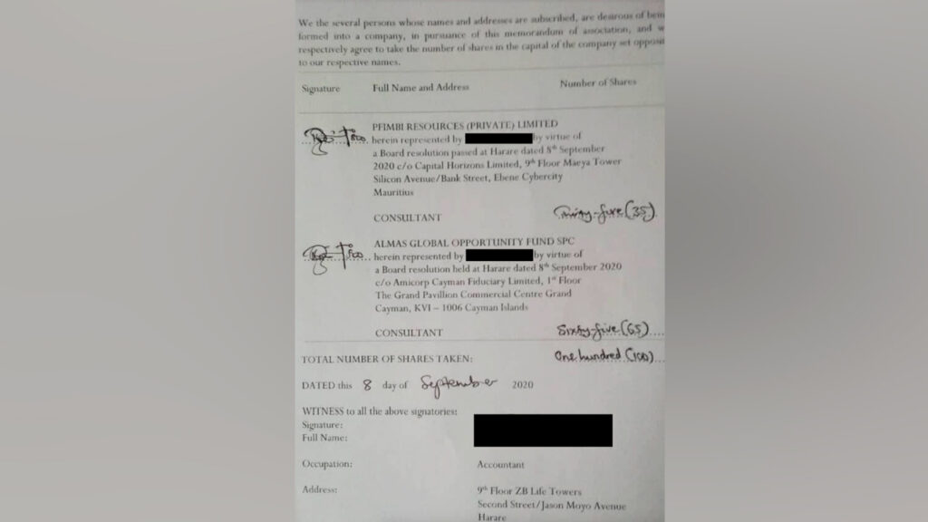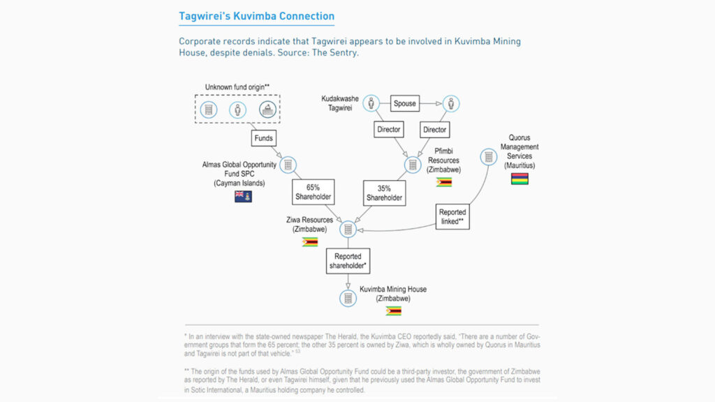 The Sentry report noted that, surprisingly, the name of Kuvimba did not appear in the company registry of the government of Zimbabwe. Ziwa Investments, too, did not appear in the company records of the Mauritius government. However, an entity named Ziwa Resources did appear in the Mauritius government’s records. Interestingly, 65% of Ziwa Resources was owned by Almas Global Opportunity Fund, and the rest was in the hands of the Zimbabwe-registered Pfimbi Resources, whose directors were Tagwirei and his wife. It also turned out that Quorus and Ziwa Resources had the same directors, and they were closely associated with Tagwirei.