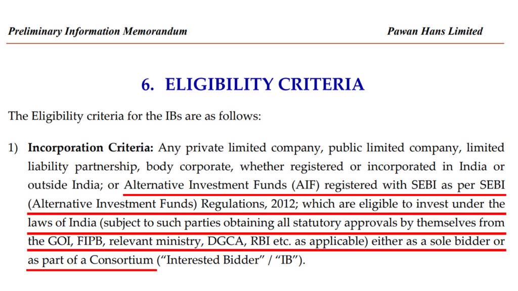 An excerpt from the Preliminary Information Memorandum of Pawan Hans Limited. The document lists the eligibility criteria for the IBsAn additional criteria for AIFs is the definition of its net worth. While the bid conditions demanded that the collective net worth of the winning bidder be more than Rs. 300 crore, in the case of the Star9 Mobility Consortium, the net worth requirement had to be entirely covered by Almas Global’s net worth, as we detailed in our previous article. In clarifications that have appeared in the media quoting anonymous government officials, it has been reported that Almas Global provided documentation of its net worth being Rs. 691 crore.