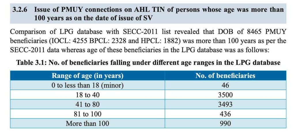 An extract from the CAG report of 2019 on the Performance Audit of Pradhan Mantri Ujjwala Yojana (PMUY) | Pic source: cag.gov.inThe audit also found that in multiple cases, LPG connections were provided to beneficiaries who were more than 100 years old. There were also numerous cases where there was a mismatch in the names of the beneficiaries between the Socio Economic & Caste Census (SECC) 2011 database and the PMUY consumer database of Oil Marketing Companies (OMCs).