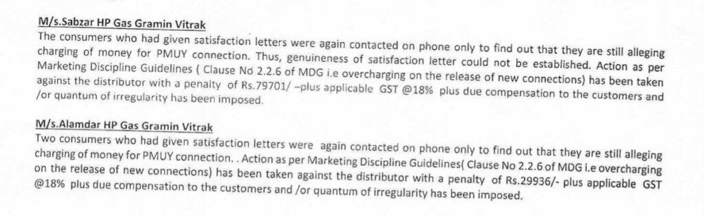 The audit report states: "These LPG connections were issued by projecting a minor applicant as an adult by entering a wrong DOB (Date of Birth) under the relevant field of the LPG database, in contravention of the LPG control order 2000. HPCL also detected 1809 connections issued to minor beneficiaries by two distributors after being pointed out by the audit, which indicates the possibility of the existence of such cases in other distributors also. Hence, there is a requirement of detailed verification of similar cases at all LPG distributors of OMCs."