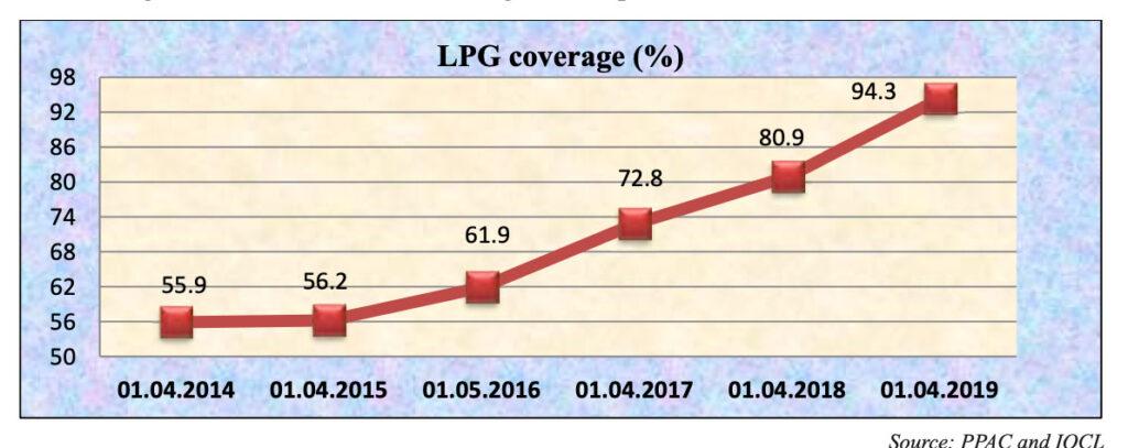 The Pradhan Mantri Ujjwala Yojana (PMUY) was launched by the Ministry of Petroleum and Natural Gas (MOPNG) in May 2016 as a flagship scheme with an objective to make Liquefied Petroleum Gas (LPG) available to rural and deprived households which were otherwise using traditional cooking fuels like firewood, coal, cow dung cakes and the likes. In bulk purchasing, the government had set the cost of LPG connection at Rs 3200. The scheme aimed to provide five crores deposit-free LPG connections to women who were devoid of LPG access and belonged to the Below Poverty Line (BPL) categories. This was to be identified from Socio Economic & Caste Census (SECC) 2011 list.