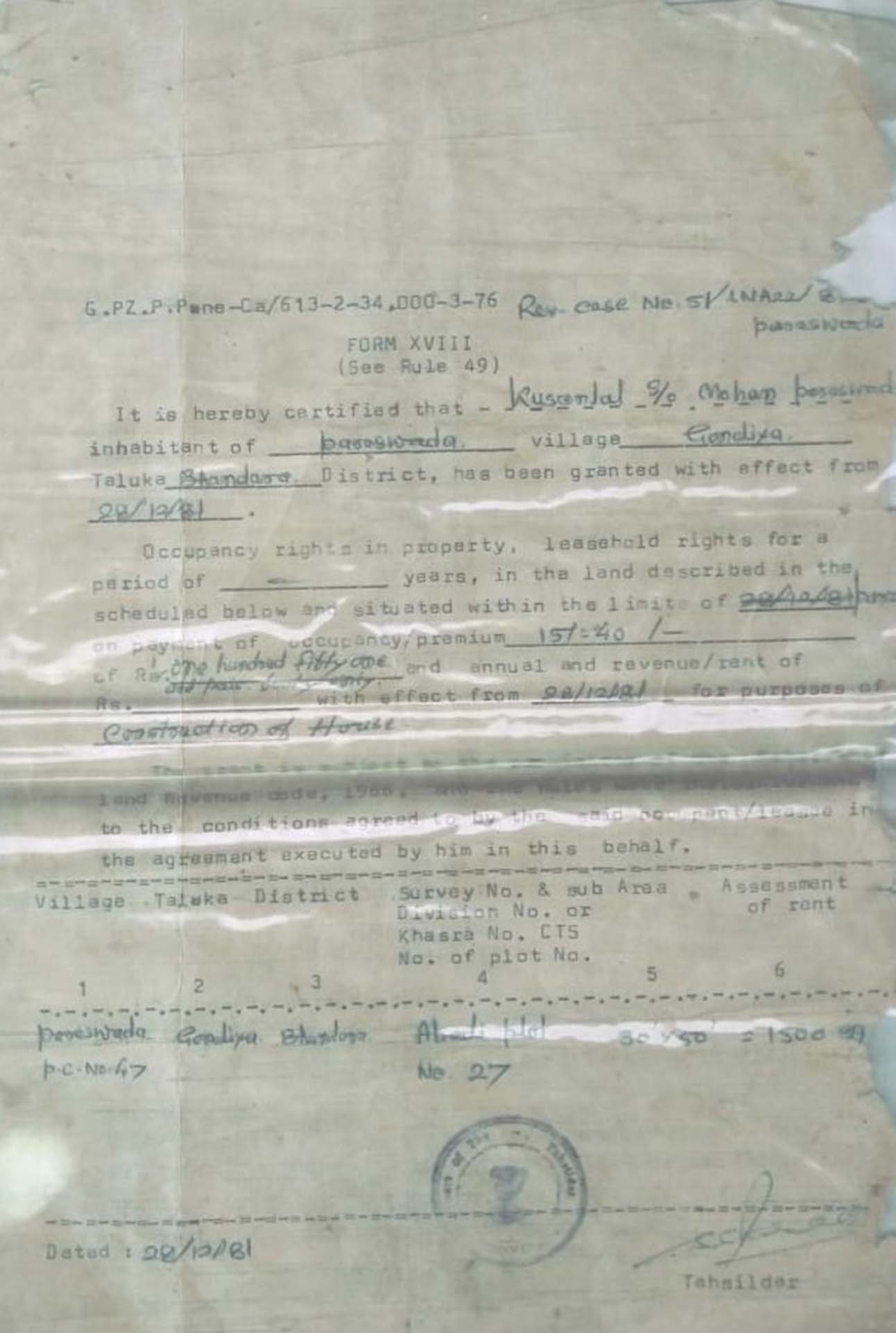 Rahul Bhave’s land deed | Photo courtesy: Raja Muzaffar BhatRahul’s father, Kusum Lal, was allotted the land in 1981 by the local revenue department. The document issued by the local Tahsildar of Gondia on 28.10.1981 says that Kusum Lal, S/O Mohan, R/O Paraswada has been given the occupancy and lease rights to construct a house in Paraswada against payment of occupancy/premium money of Rs 151 and 40 paise.