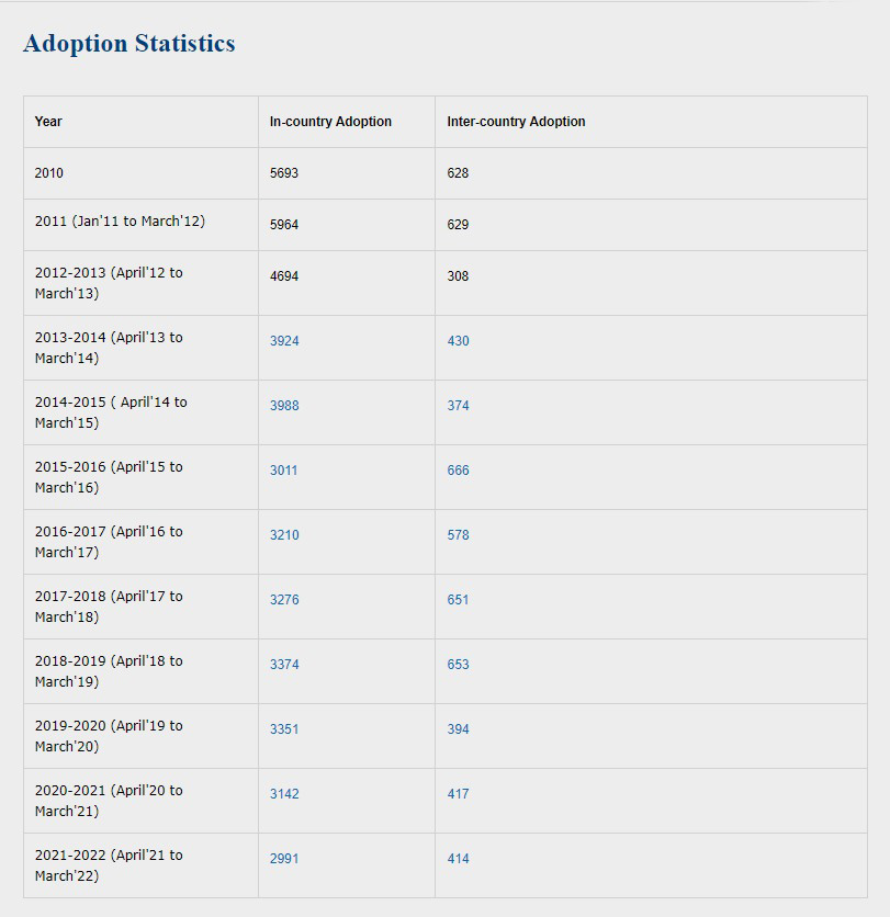 According to UNICEF, India has about 29.6 million orphaned and abandoned children. But the Central Adoption Resource Authority, which falls under the Ministry of Women and Child Development, has alarming adoption statistics. Take a look at India's in-country and inter-country adoption statistics from 2010 to 2022. The adoption numbers have been steadily declining year on year.